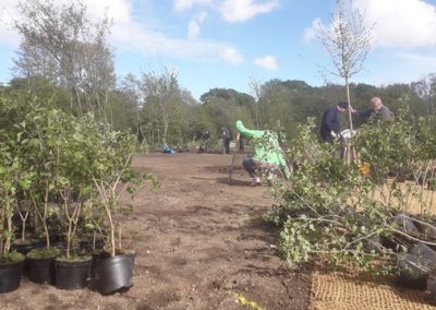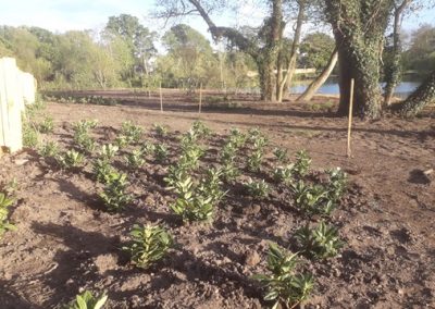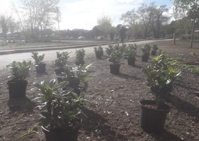 Abelia’s, Dwarf Rhododendrons, Tamarix, Guelder Rose and Common Box have been planted to create areas of low ground-cover, as well as taller shrub mixes. These are interspersed between the recently planted trees and in time an informal path will snake through this large area of planting.